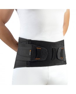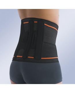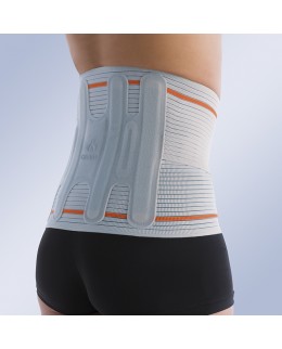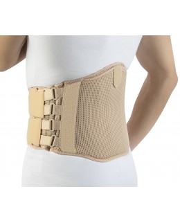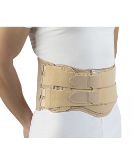 Corsé bivalvo formado por una placa delantera, una placa trasera y zonas de solape lateral todas en termoplástico y con fuertes ballenas laterales conformadas.