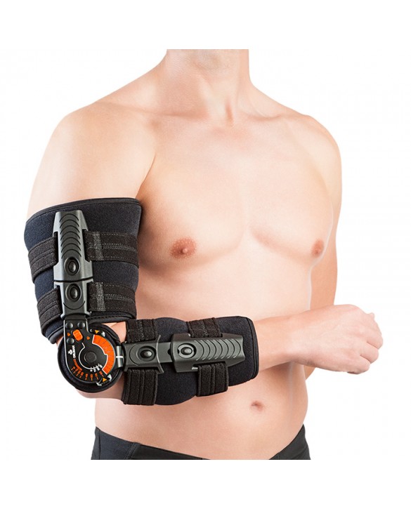 Características: Ortesis de codo con articulación monocéntrica unilateral para un perfecto control de la amplitud de movimientos o inmovilización del