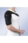 Ortesis de húmero bivalva termoconformada en polietileno de baja densidad, recubierto de una funda textil acolchada. Forro interior de tejido de panal transpirable. 2 valvas termoplásticas ensambladas en el forro unidas mediante tejido elástico. Sistema de ajuste mediante 2 cinchas humerales en velour y cierre microgancho. Sistema de suspensión y fijación mediante cincha pectoral. El brace viene acompañado de cincha para la desgravación del brazo.