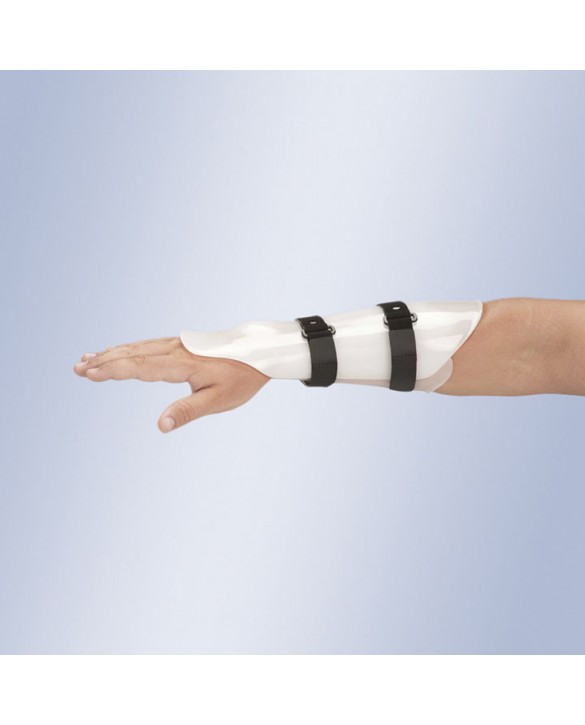 Fabricada en polietileno de baja densidad compuesta por 2 valvas unidas entre si, mediante cinchas de velour y cierre de microgancho. En su cara dorsal se encuentra prolongada en la mano hasta la articulación metacarpofalángica. Acolchado interior en plastazote.