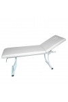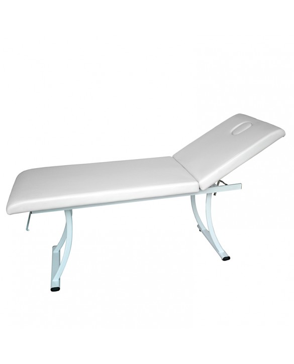 Camilla fija multifuncional de 2 cuerpos de estructura robusta. Inclinación del respaldo ajustable manualmente con agujero facial. Tapizado blanco en