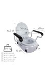 Este elevador de WC con brazos abatibles es regulable en altura. Sus reposabrazos abatibles facilitan la transferencia lateral, estabilizan y ayudan al usuario a sentarse y levantarse. Para instalarlos se debe quitar las tapas originales del wc. Se fija mediante tornillos y tuercas en la parte trasera.