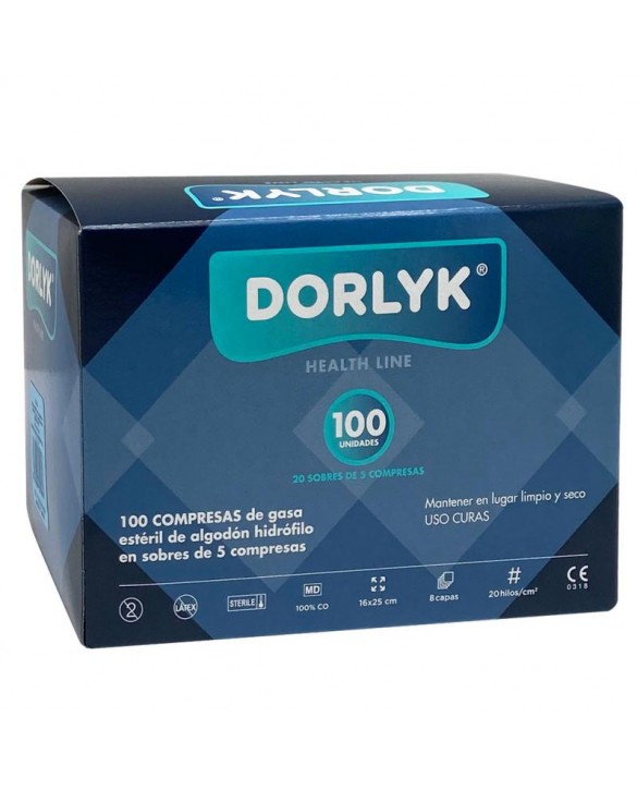 Gasas en sobres esterilizados de cinco unidades, tejidas en trama de veinte hilos de urdimbre por centímetro cuadrado, con superficie de 16*25 cm y plegado de 7*5 cm y 8 capas de grosor.