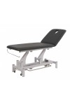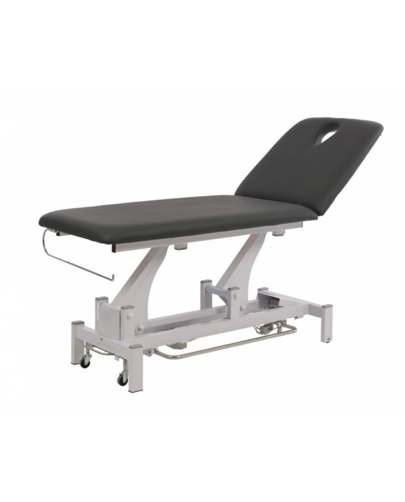 Camilla de 2 secciones especialmente indicada para tratamientos de fisioterapia con agujero facial y cojín apoyacabezas. Equipada con 1 motor que controla la altura mediante perimetral y respaldo regulable mediante pistón de gas. Cuenta con 4 ruedas, 2 de ellas activables para facilitar el desplazamiento. Tapizado gris en PVC y portarrollos incluido.