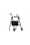 Andador de aluminio regulable en altura. Asiento acolchado. Puños con forma ergonómica. Plegable y desmontable, con cesta textil.