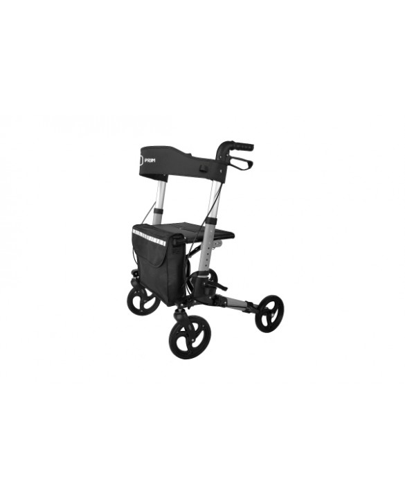Andador de 4 ruedas fabricado en aluminio. Especial viajes. Ligero, plegable y con puños ergonómicos. Dispone de un asiento acolchado con respaldo, al lado del que se encuentra una práctica bolsa.