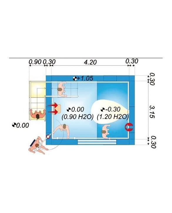Sistema de tratamiento del agua compuesto de: filtro de 15 m3/h, bomba de filtración trifásica de 0,75 Kw., filtros skimmer, reductor de presión de agua, control automático del nivel del agua y tablero de control general
