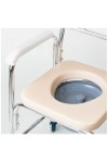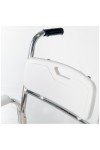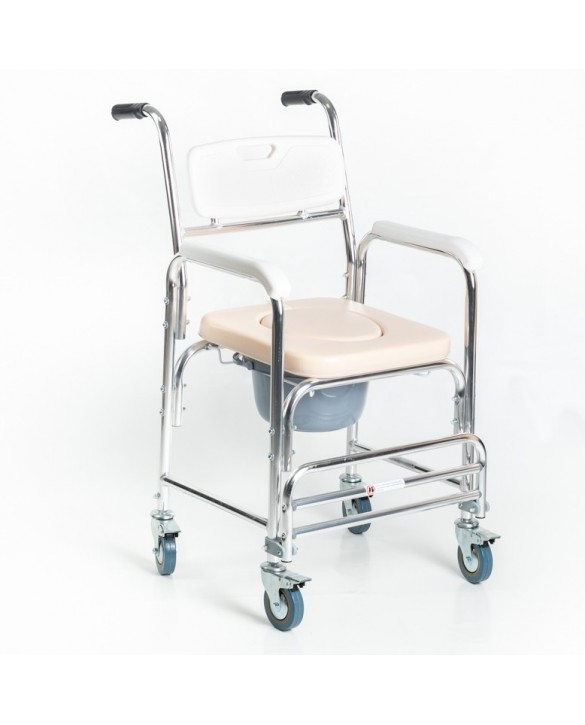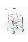Silla de ducha con ruedas e inodoro fabricada en aluminio. Las ruedas traseras y delanteras incluyen frenos. Asiento cómodo acolchado. Se puede